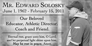 As a coach Ed led the Boys’ Volleyball team to two NSCHSAA Titles in 1995 and 1997.  He also coached Varsity Softball as an assistant coach.  However, it was Freshman Football that had a special place in Ed’s heart.  He treated those boys as if they were his sons.  Coach Solosky loved them, all of them.  He treated the least talented player on the team as if he were the starting quarterback.  His door was always open to those football players several years after their freshman campaign had ended.  It was in the wrestling room during his legendary pre-game speeches where he coined the phrase “Dare to be Great!”, encouraging the young men to not settle for mediocrity.